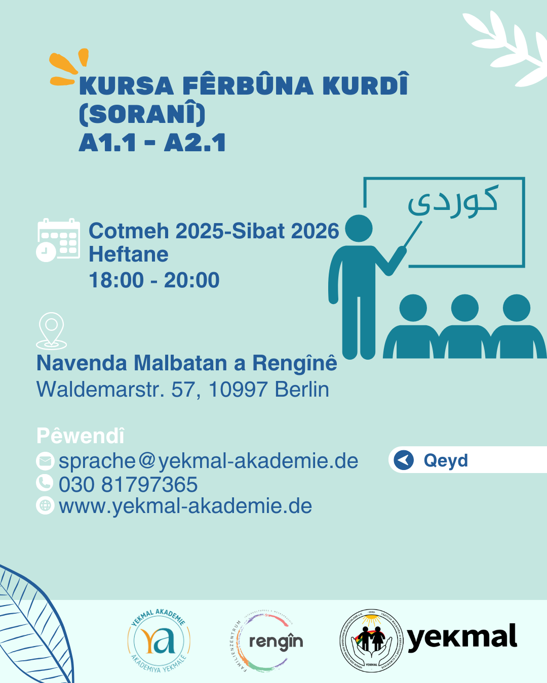 Akademiya Yekmalê bi hevkariya Navenda me ya Malbatan a Rengînê li Berlînê di asta A1.1 û A2.1 de kursên fêrbûna Soranî li dar dixe.