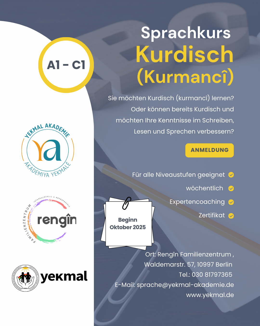 Die Yekmal Akademie bietet in Zusammenarbeit mit unserem Familienzentrum Rengîn in Berlin Kurmancî-Sprachkurse von der Anfangsstufe bis zur Fortgeschrittenenstufe (A1.1, A2.1, B1.1, B2.1, C1.1) an.